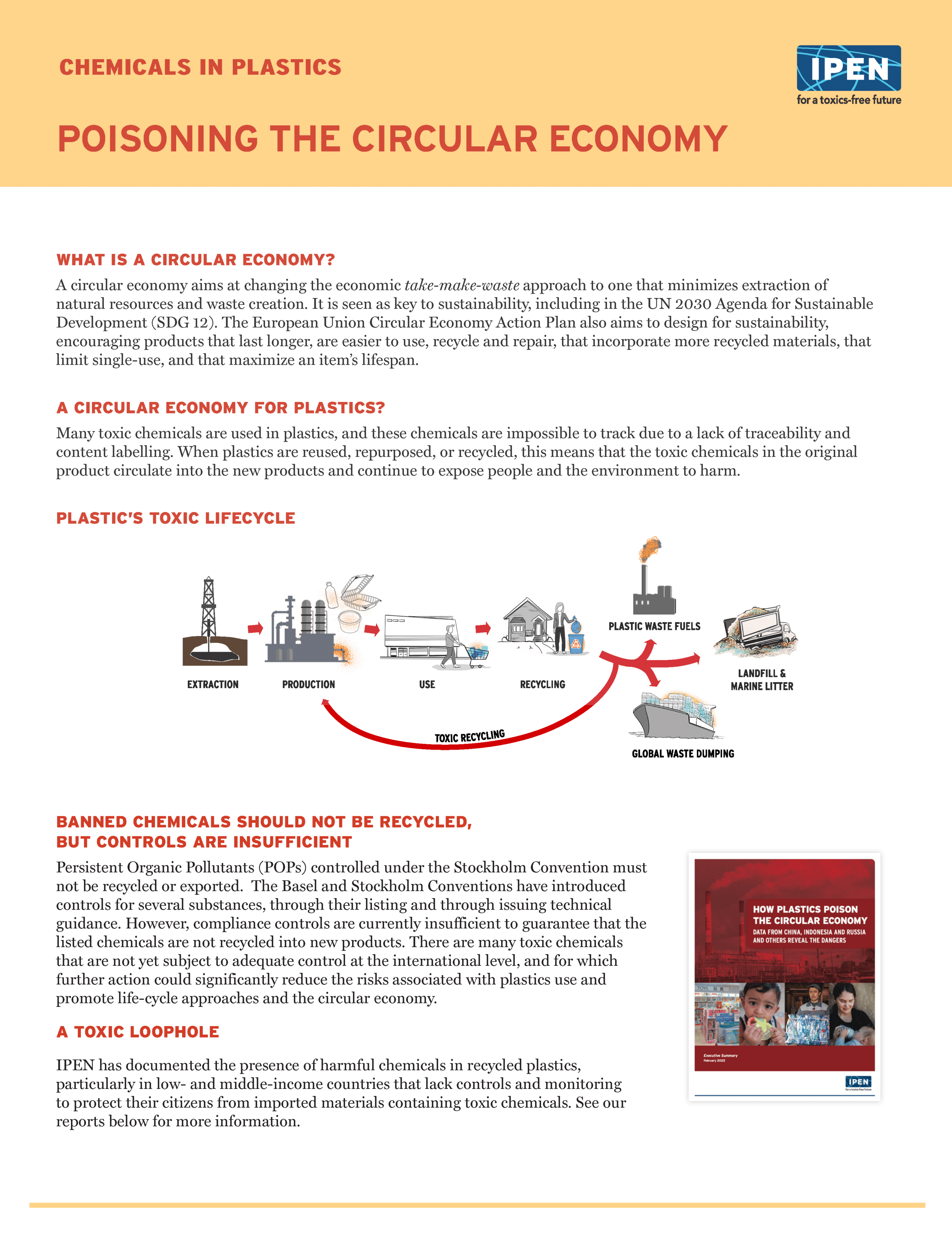 IPEN has documented the presence of harmful chemicals in recycled plastics, particularly in low- and middle-income countries that lack controls and monitoring to protect their citizens from imported materials containing toxic chemicals. See our reports below for more information.