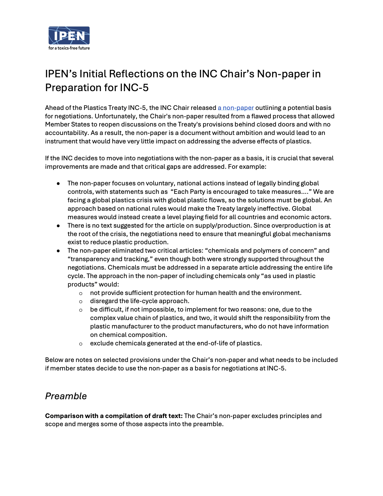 Download the full brief below with our notes on selected provisions under the Chair’s non-paper and what needs to be included if member states decide to use the non-paper as a basis for negotiations at INC-5.