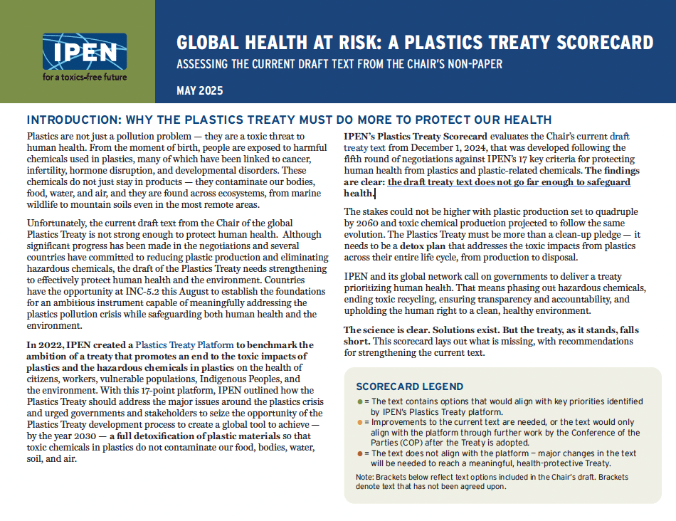 IPEN’s Plastics Treaty Scorecard evaluates the Chair’s current draft treaty text from December 1, 2024, that was developed following the fifth round of negotiations against IPEN’s 17 key criteria for protecting human health from plastics and plastic-related chemicals. The findings are clear: the draft treaty text does not go far enough to safeguard health.